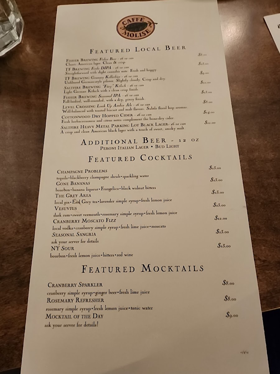Caffé Molise offers a delightful menu that features a robust selection of Italian dishes, each crafted with passion and attention to detail. Dive into their pasta offerings, such as the Scampi alla Diavola—a spicy shrimp fettuccine that has left patrons like David Sampson raving about its incredible taste. Or, for a heartier option, enjoy the Bistecca beef tenderloin paired perfectly with a glass of wine from their exquisite selection, including choices like the Cetamura Chianti 2022 and Di Majo Norante Sangiovese 2021.